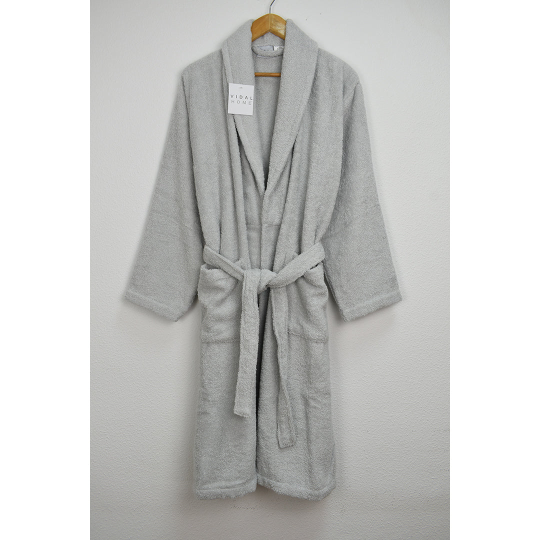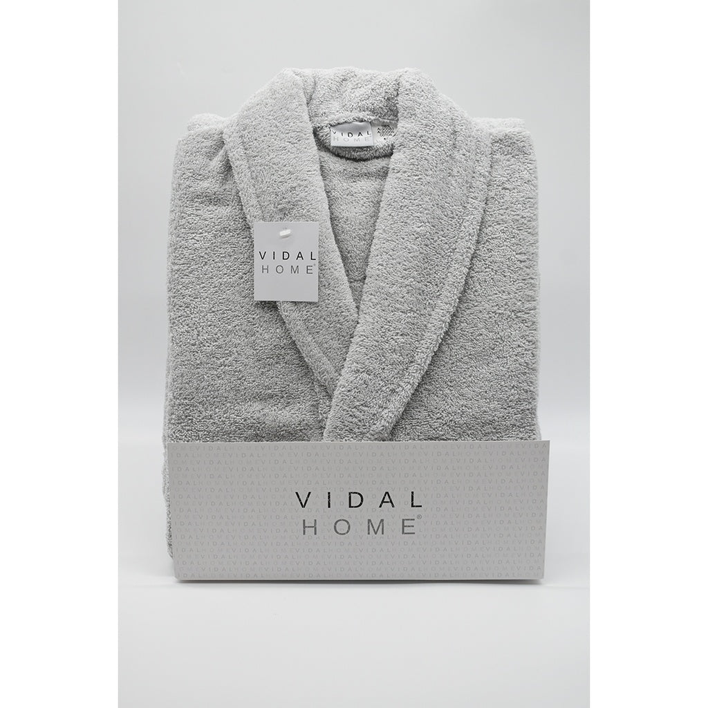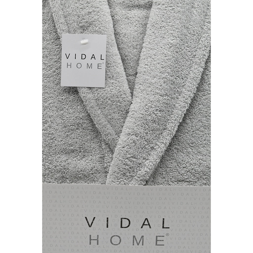 Albornoz de rizo americano premium, de la marca Vidal Home. Albornoz gris confeccionado en 100% algodón peinado de alta calidad, con cuello smoking y un gramaje de 400 gr/m2. Tiene una gran suavidad y absorción. Cierre mediante cinturón y dispone de 2 bolsillos a la altura de la cintura.