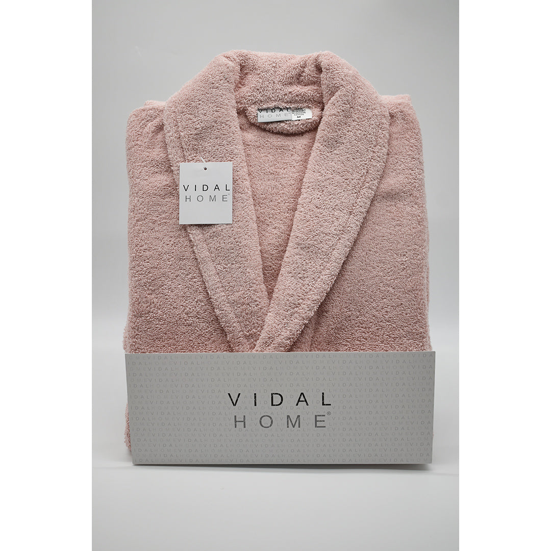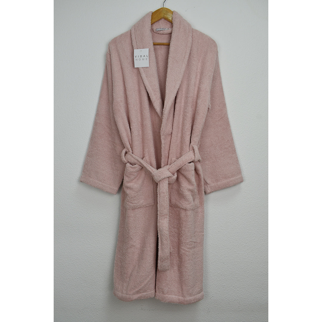 Albornoz de rizo americano premium, de la marca Vidal Home. Albornoz rosa confeccionado en 100% algodón peinado de alta calidad, con cuello smoking y un gramaje de 400 gr/m2. Tiene una gran suavidad y absorción. Cierre mediante cinturón y dispone de 2 bolsillos a la altura de la cintura.