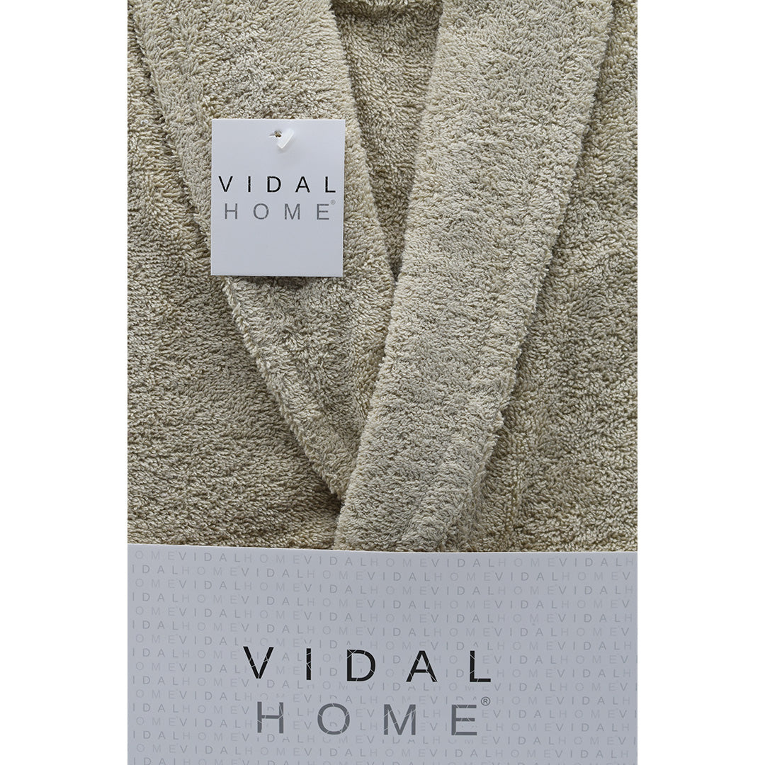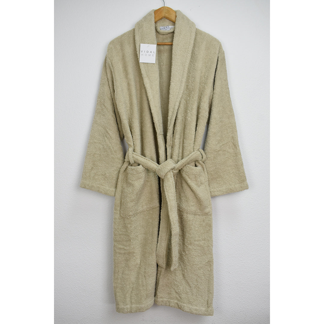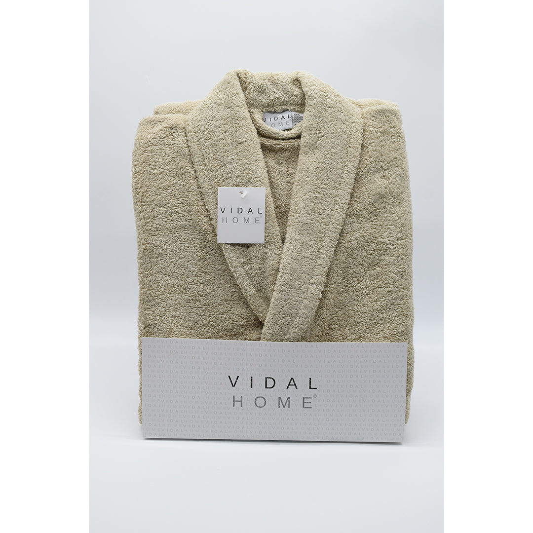 Albornoz de rizo americano premium, de la marca Vidal Home. Albornoz taupe confeccionado en 100% algodón peinado de alta calidad, con cuello smoking y un gramaje de 400 gr/m2. Tiene una gran suavidad y absorción. Cierre mediante cinturón y dispone de 2 bolsillos a la altura de la cintura.