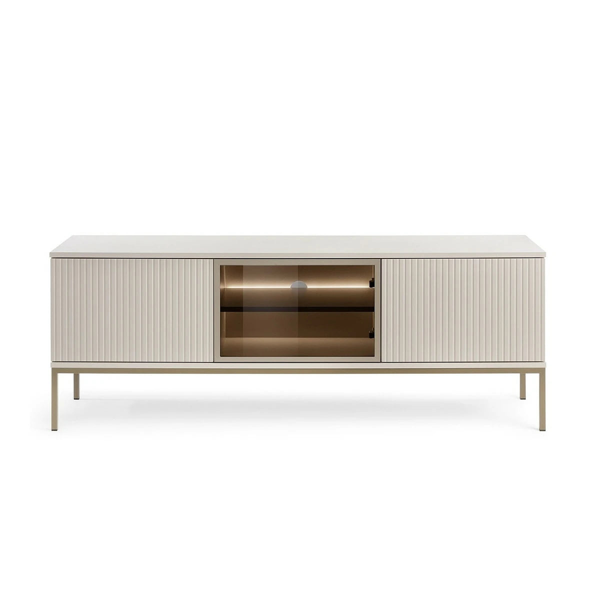 Bajo TV 3/P en melamina y MDF, con patas metálicas. Diseño con listones en la puerta y un elegante compartimento de vidrio con iluminación LED integrada. Ideal para espacios sofisticados y funcionales. Medidas: 56 X 154 X 39cm. Colores:cachemir roble wotan.