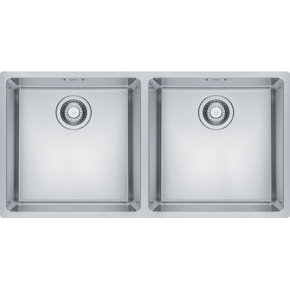 Mueble: 90 cm Instalación: Encastre / A ras Material: Acero inoxidable Totales: 861 x 436; R10 mm Cubetas: 400 x 400 x 180; R16 mm 400 x 400 x 180; R16 mm Encastre: 835 x 410; R10 mm