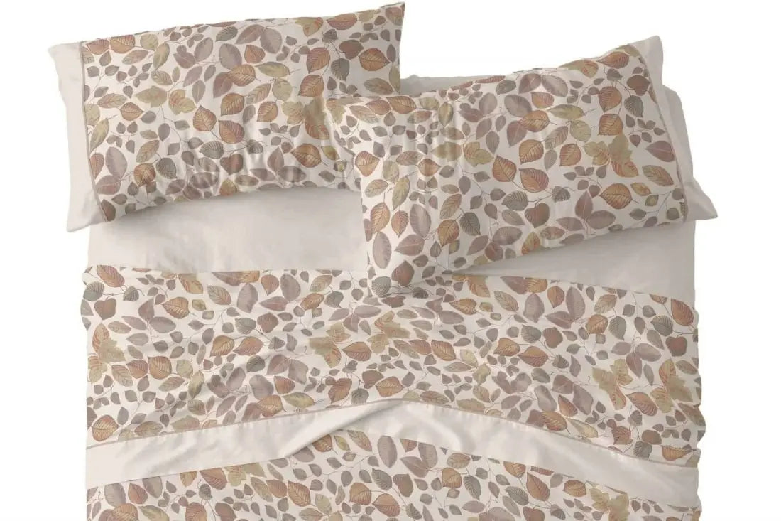 Juego de sábanas de tela, referencia 049, en color canela, de la marca Burrito Blanco. Tonos cálidos de la naturaleza en estas sábanas de Burrito Blanco, con un diseño botánico en teja, camel, beige, canela, piedra y salvia sobre un fondo beige claro. El embozo de la sábana encimera, la bajera ajustable y las bocas almohada en beige claro, con un ribete de adorno en camel. Son sábanas calidad Burrito Blanco, las de toda la vida. Conjunto de sábanas ideal para colchones altos de hasta 32 cm.