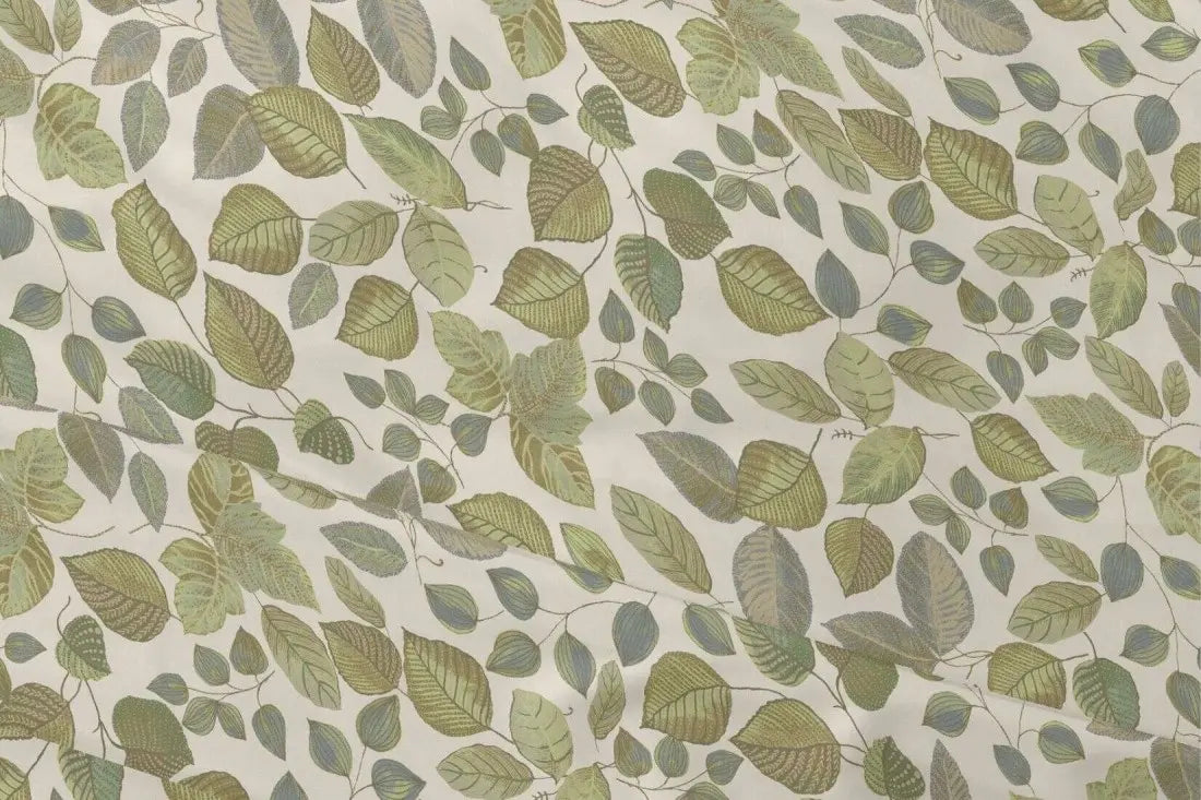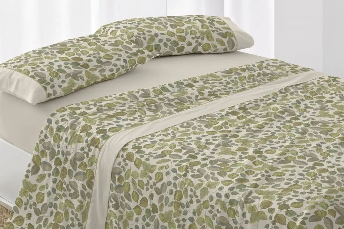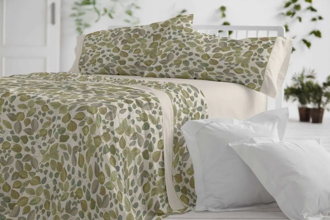 Juego de sábanas de tela, referencia 049, en color musgo, de la marca Burrito Blanco. Inspirado en cuadernos de naturalista, este juego de sábanas de Burrito Blanco presenta un estampado botánico. Sus hojas, en tonos verdes como kiwi, salvia, musgo y turquesa grisáceo, sobre un fondo ecru claro, son una celebración de la naturaleza. La sábana bajera, las aplicaciones del embozo y almohada en ecru claro, con un ribete de realce del mismo color. El color "ecru" predominante en este juego de sábanas es un tono neutro muy suave, a menudo descrito como el color de la seda o el lino sin blanquear. Juego de sábanas adaptable a colchones de gran altura, máximo 32 cm.