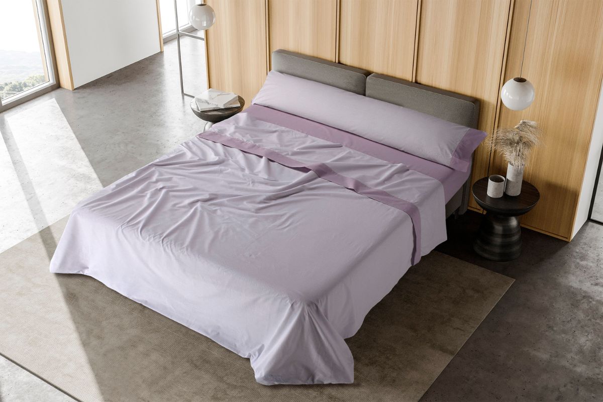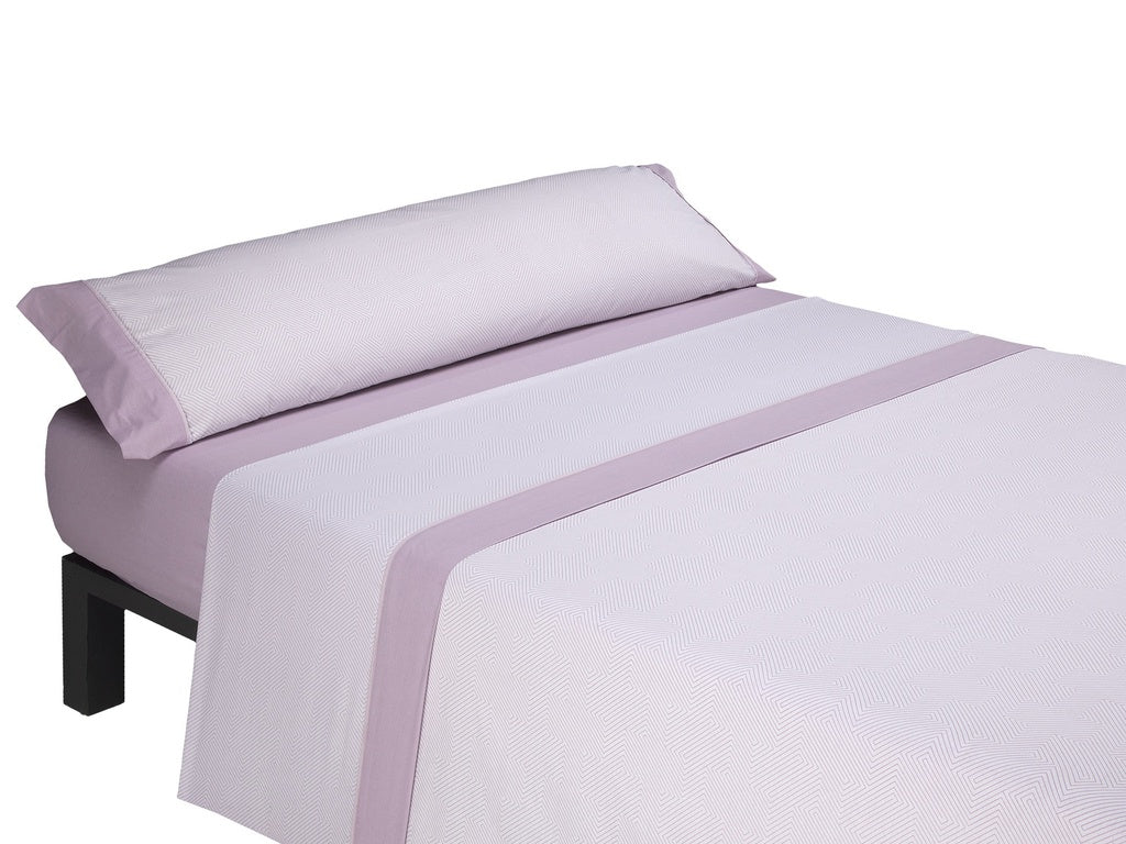 Juego de sábanas de tela, modelo Q72, en color lila, de la marca Mora. Juego de cama de 3 o 4 piezas para verano, que incluye: sábana encimera con estampado, bajera ajustable en color lila liso y funda de almohada con el mismo estampado que la encimera. Su confección en 50% Algodón y 50% Poliéster facilita el planchado y su mantenimiento, además aporta la frescura y transpirabilidad que necesitas. La sábana bajera es ajustable, con goma perimetral que ayuda a la hora de ajustarla al colchón, y sirve para largos tanto de 190 como de 200 cm. Válido para altura de colchón hasta 30 cm.
