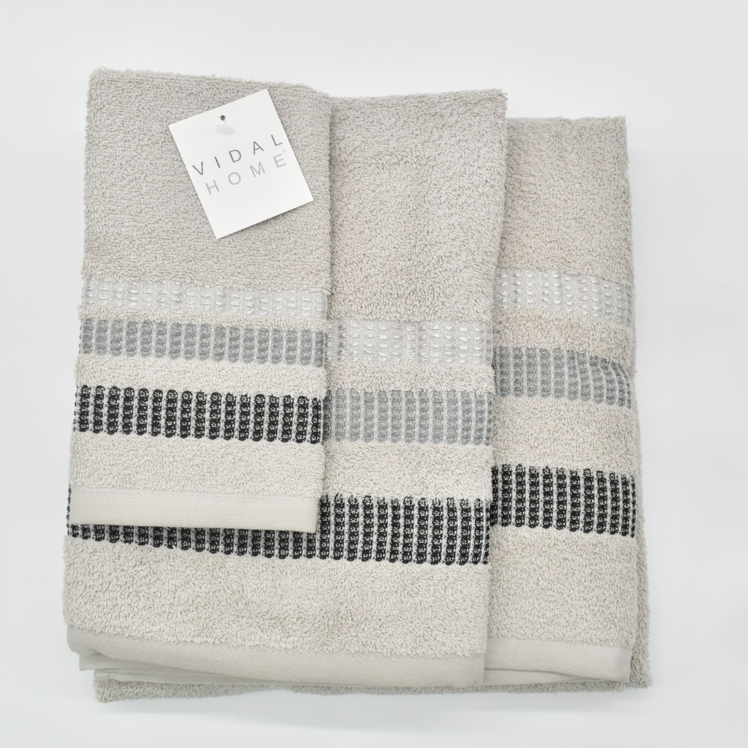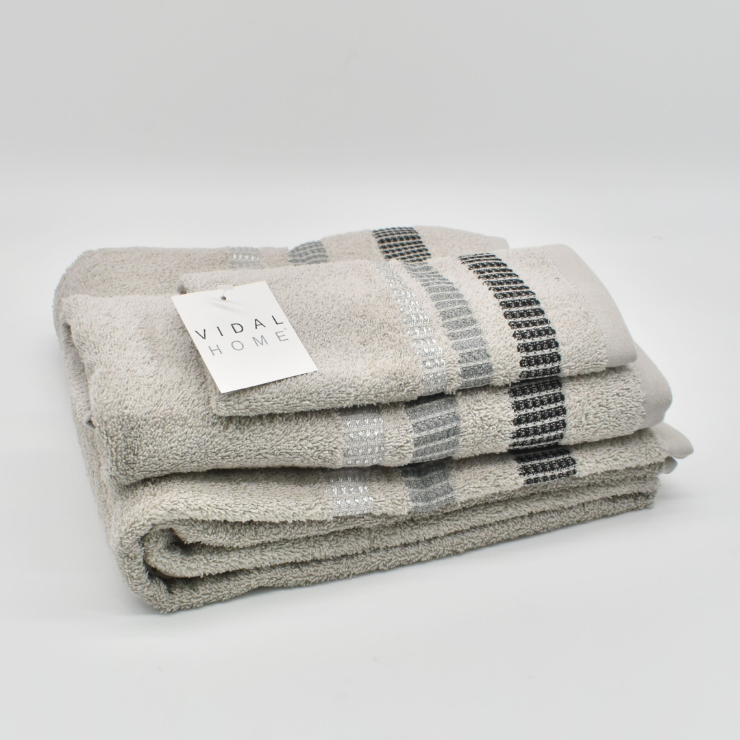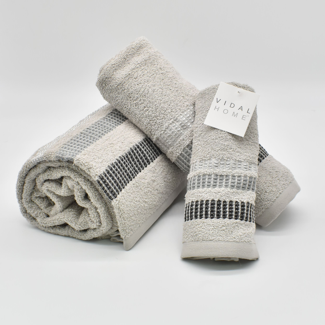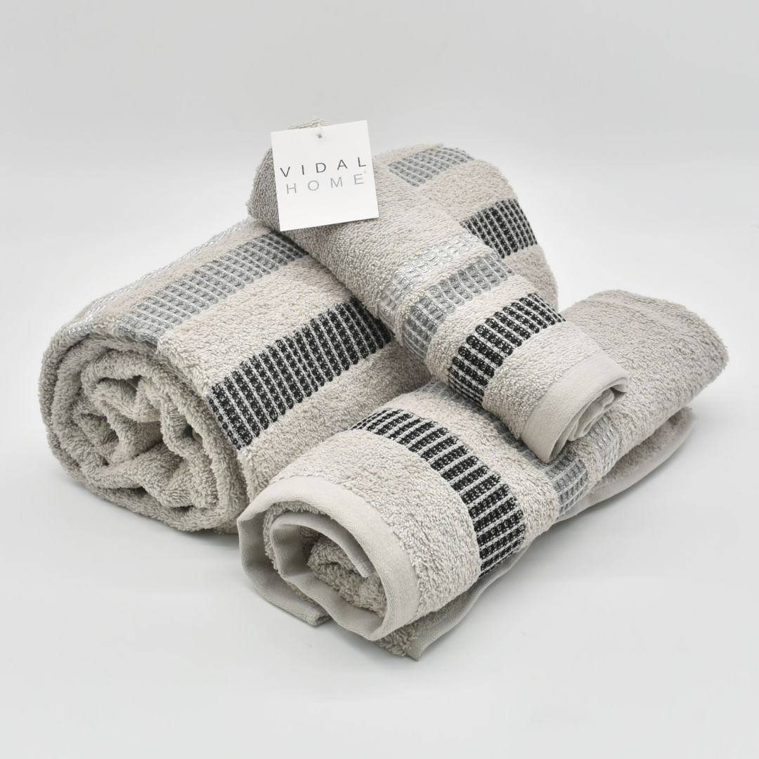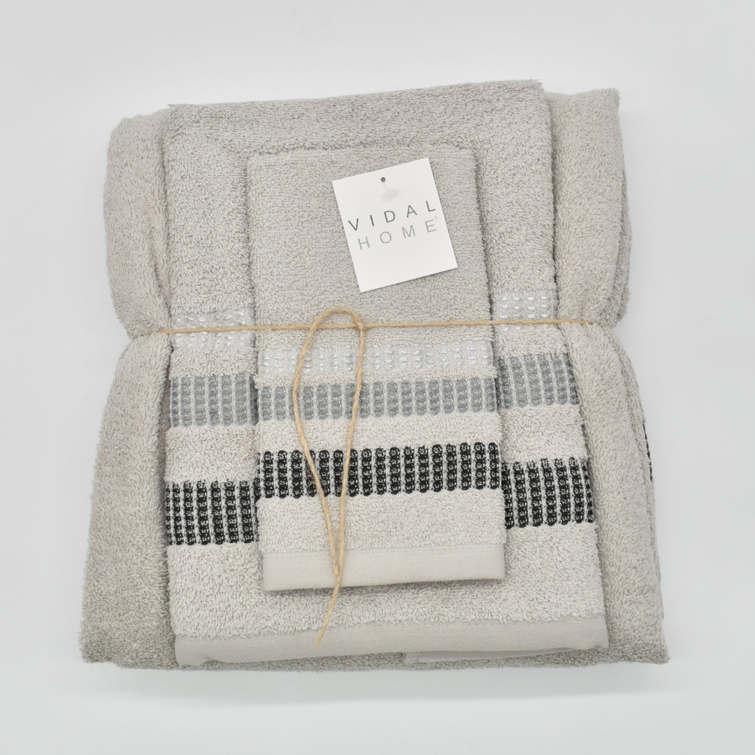 Juego de toallas confeccionado en 100% algodón, modelo Chloe. Juego de 3 toallas en color gris de Vidal Home, que destaca por su diseño con cenefas en diferentes tonos de grises en contraste con el fondo color natural. Cuenta con un gramaje de 500 gr/m2, es de tacto suave, muy absorbente y resistente a los sucesivos lavados sin perder su color original. Contiene una toalla de tocador (30x50 cm), una de lavabo (50x100 cm) y una de sábana (100x150 cm).
