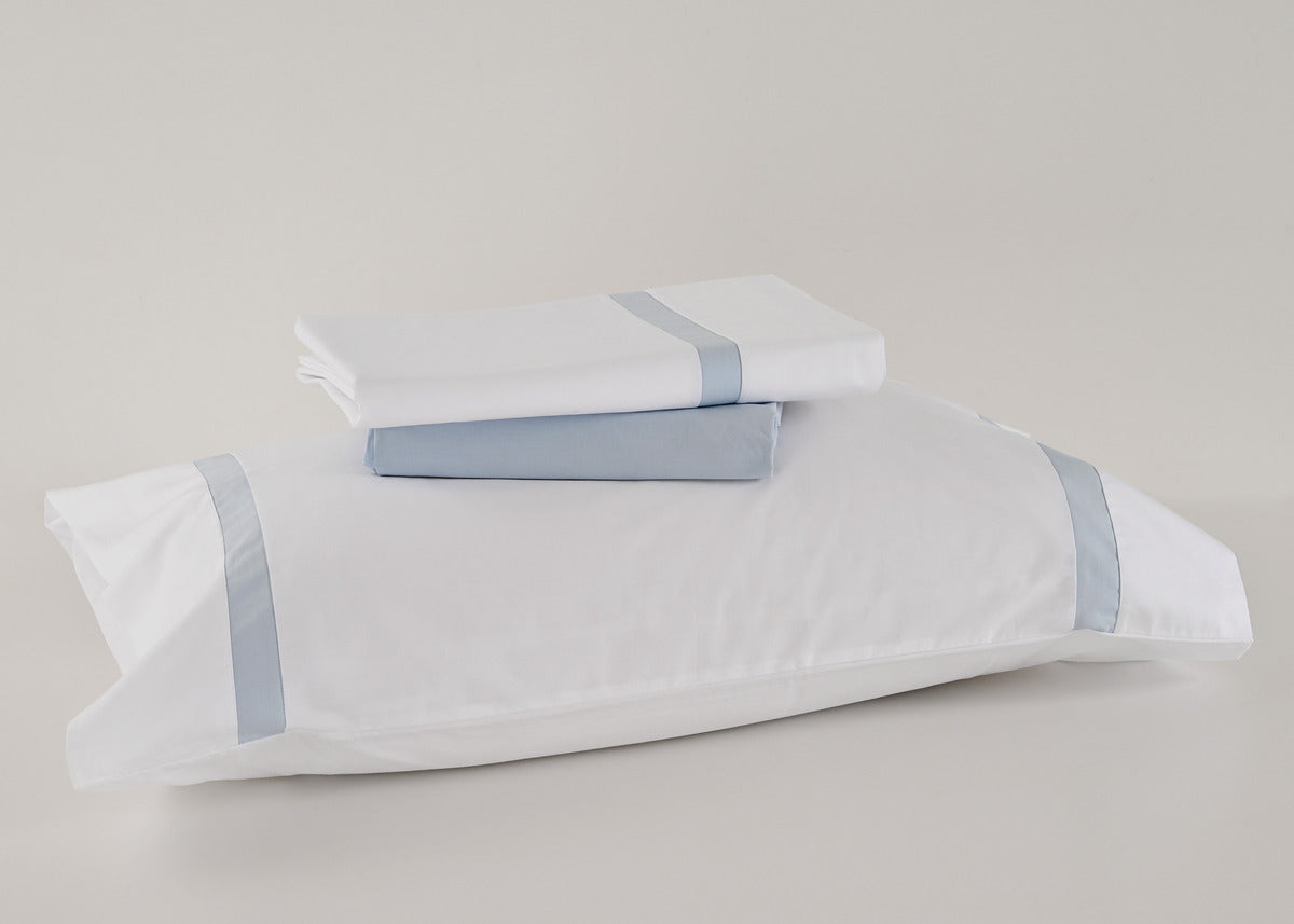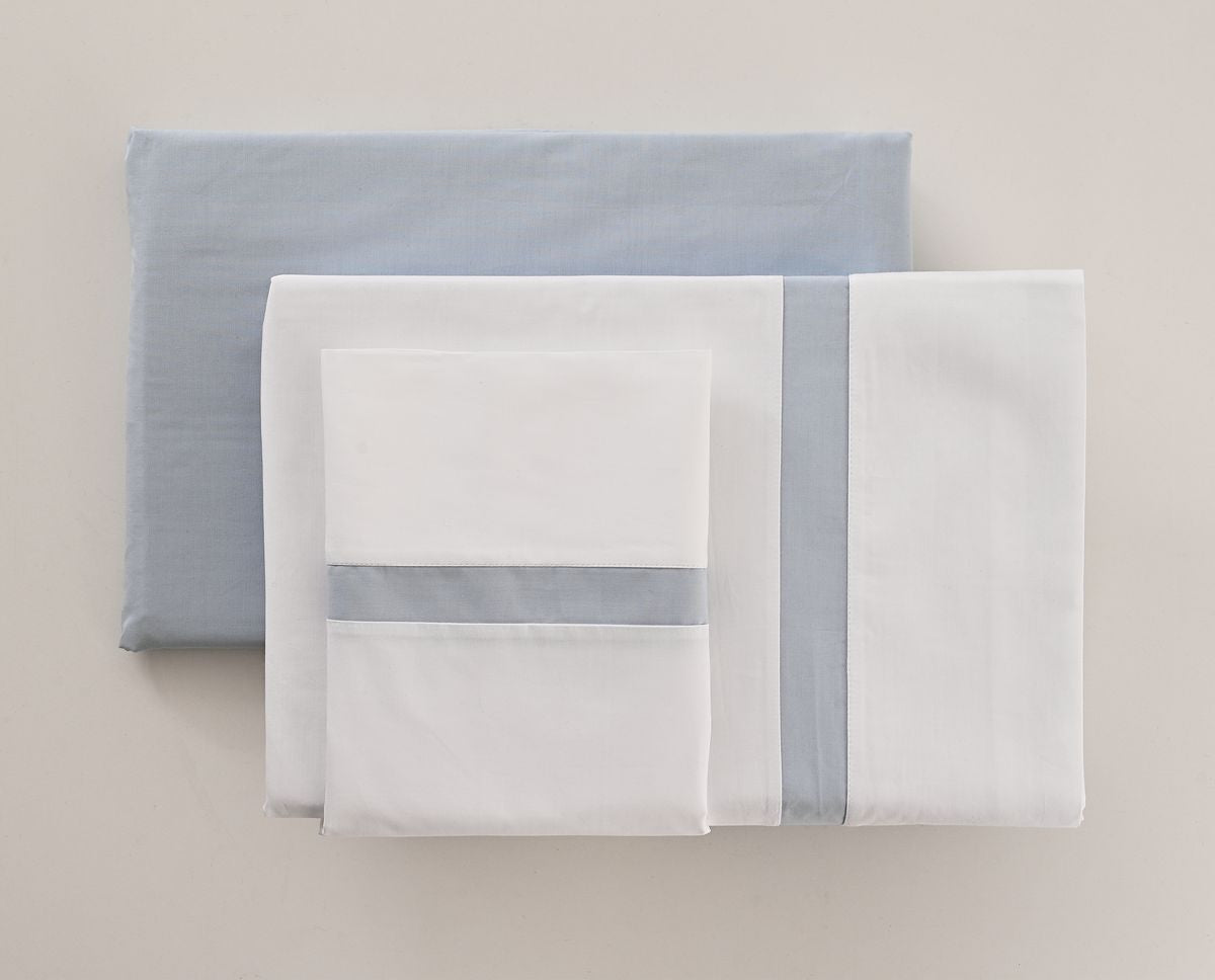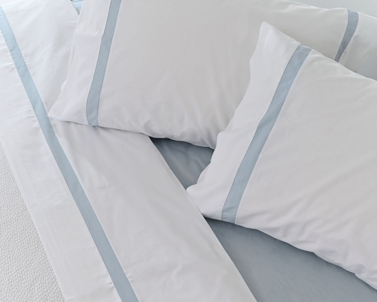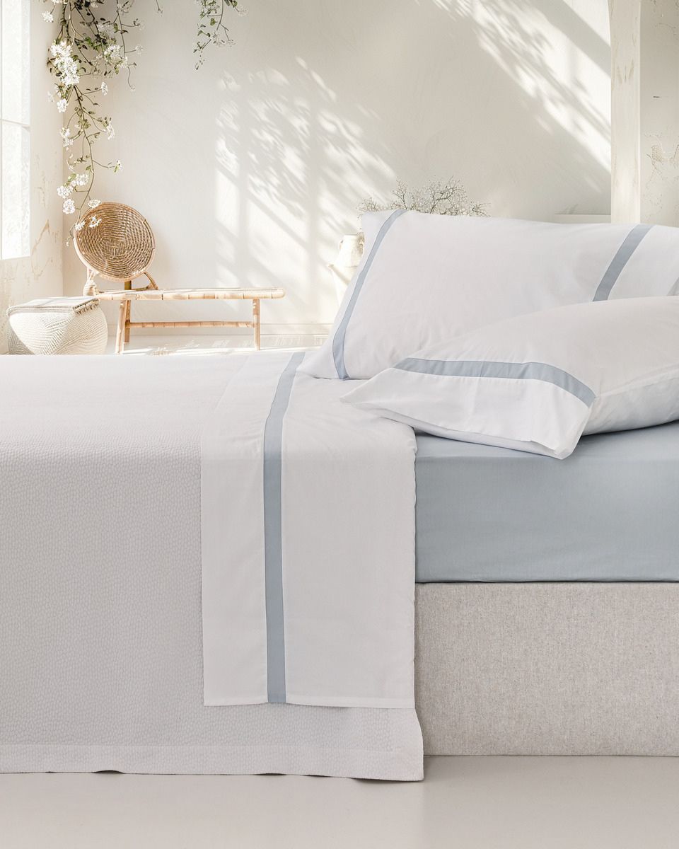 Juego de sábanas de 100% algodón percal peinado 200 hilos en color blanco-azul, de la marca Vidal Home. Juego de cama liso en 100% algodón. Incluye sábana encimera, sábana bajera con goma perimetral ajustable al colchón y 1 o 2 fundas de almohada dependiendo de la medida (ver medidas abajo). Con vivo en la encimera y en la/s funda/s de almohada de color azul, que le otorga un toque de elegancia. Percal peinado 200 hilos, tejido de calidad premium, válido para largos de colchón de 190 y 200 cm. Altura máxima de colchón 32 cm.