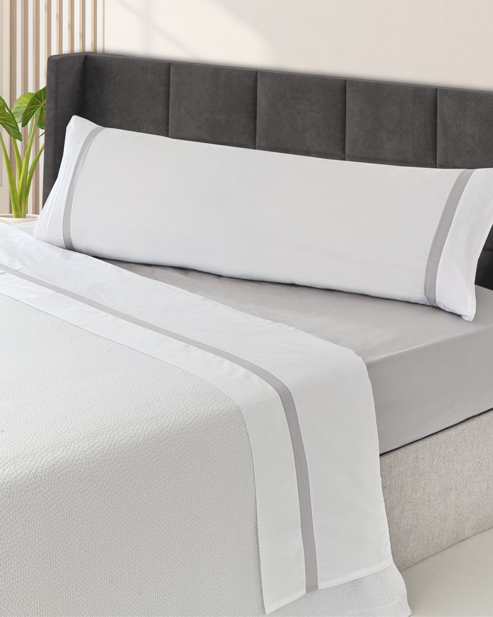 Juego de sábanas de 100% algodón percal peinado 200 hilos en color blanco-gris, de la marca Vidal Home. Juego de cama liso en 100% algodón. Incluye sábana encimera, sábana bajera con goma perimetral ajustable al colchón y 1 o 2 fundas de almohada dependiendo de la medida (ver medidas abajo). Con vivo en la encimera y en la/s funda/s de almohada de color gris, que le otorga un toque de elegancia. Percal peinado 200 hilos, tejido de calidad premium, válido para largos de colchón de 190 y 200 cm. Altura máxima de colchón 32 cm.