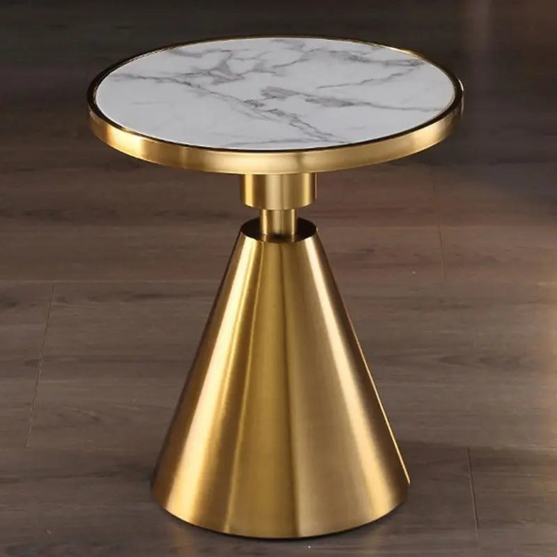 Mesa baja, diseño, armazón de acero inoxidable con acabado dorado, tapa de cerámica imitando a mármol blanco, 50 cms de diámetro. Altura 56 cms.