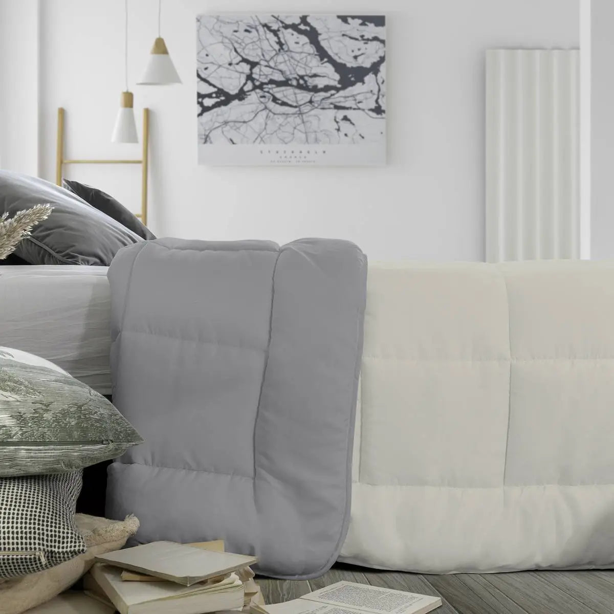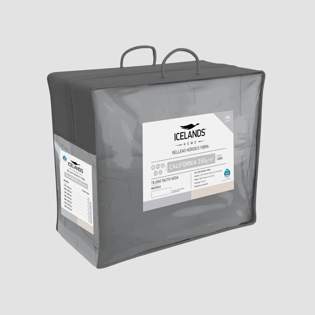 Nórdico bicolor California 350 gr/m2 de Icelands, en color gris. Se trata de un relleno nórdico bicolor tacto seda relleno de fibra hueca siliconada, que se puede utilizar por ambas caras gracias a sus dos colores. Nuestro producto más todoterreno en cualidades no quiere que renuncies al color.