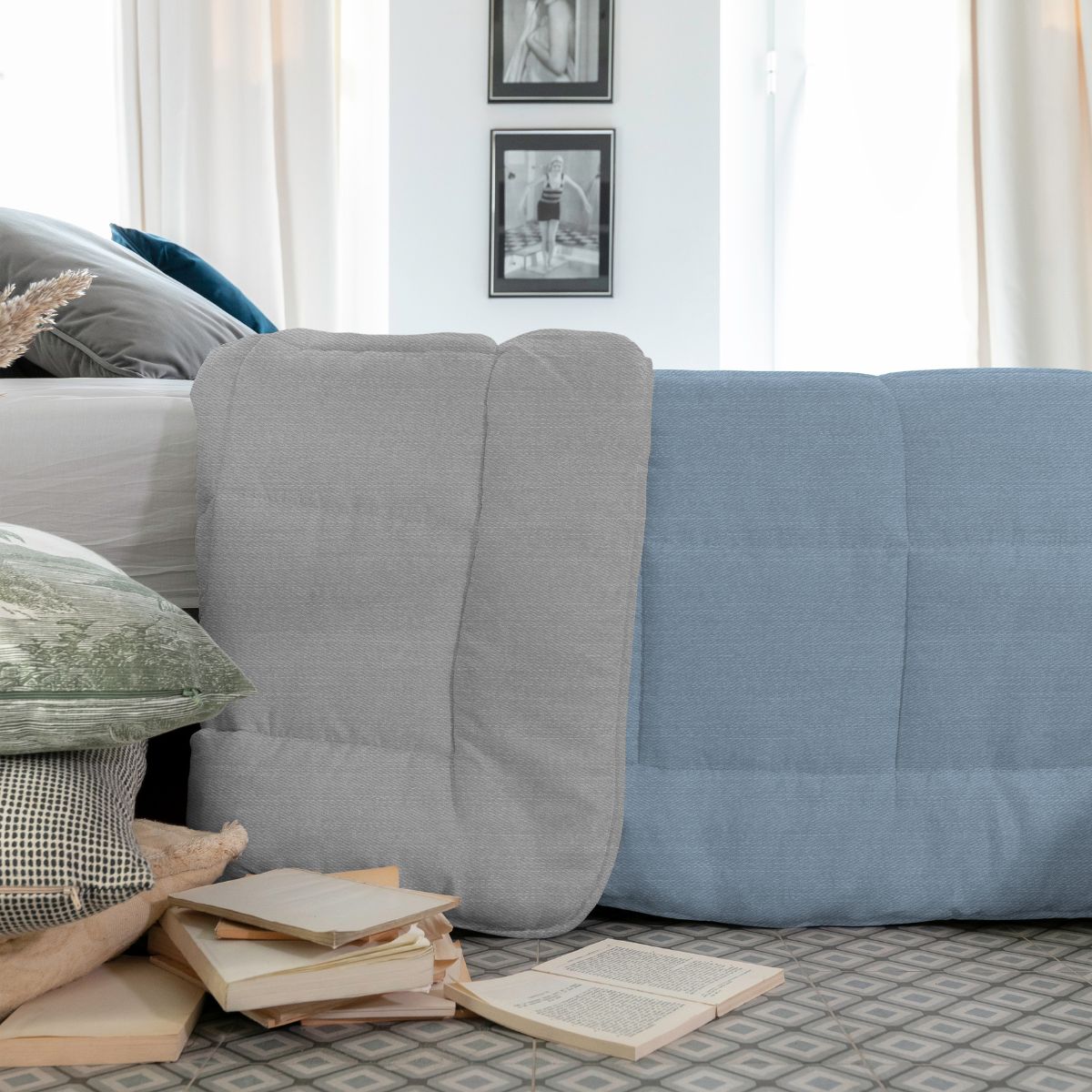 Edredón nórdico reversible, modelo Vigoré en color azul/rosa, de la marca Icelands. Nórdico de 300 gr/m2 en tejido vigoré, reversible en color azul por un lado y gris por el otro, con relleno de fibra hueca siliconada. Tratamiento antiácaros. Nivel térmico 3, este nórdico está pensado para usar en otoños o inviernos con habitaciones sin calefactar y/o con poco aislamiento térmico.