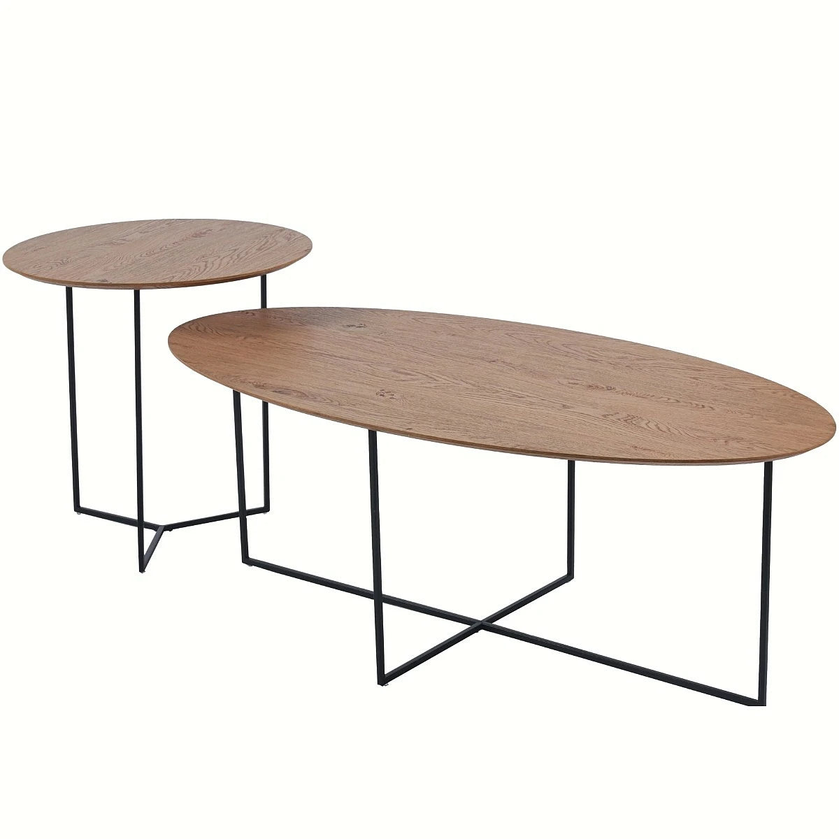 Juego de mesas auxiliares de centro con tapa de MDF laminado en color roble y patas metálicas en negro liso. Diseño moderno, resistente y versátil. Medidas: 120 X 60 X 41cm / 55 X 51cm.