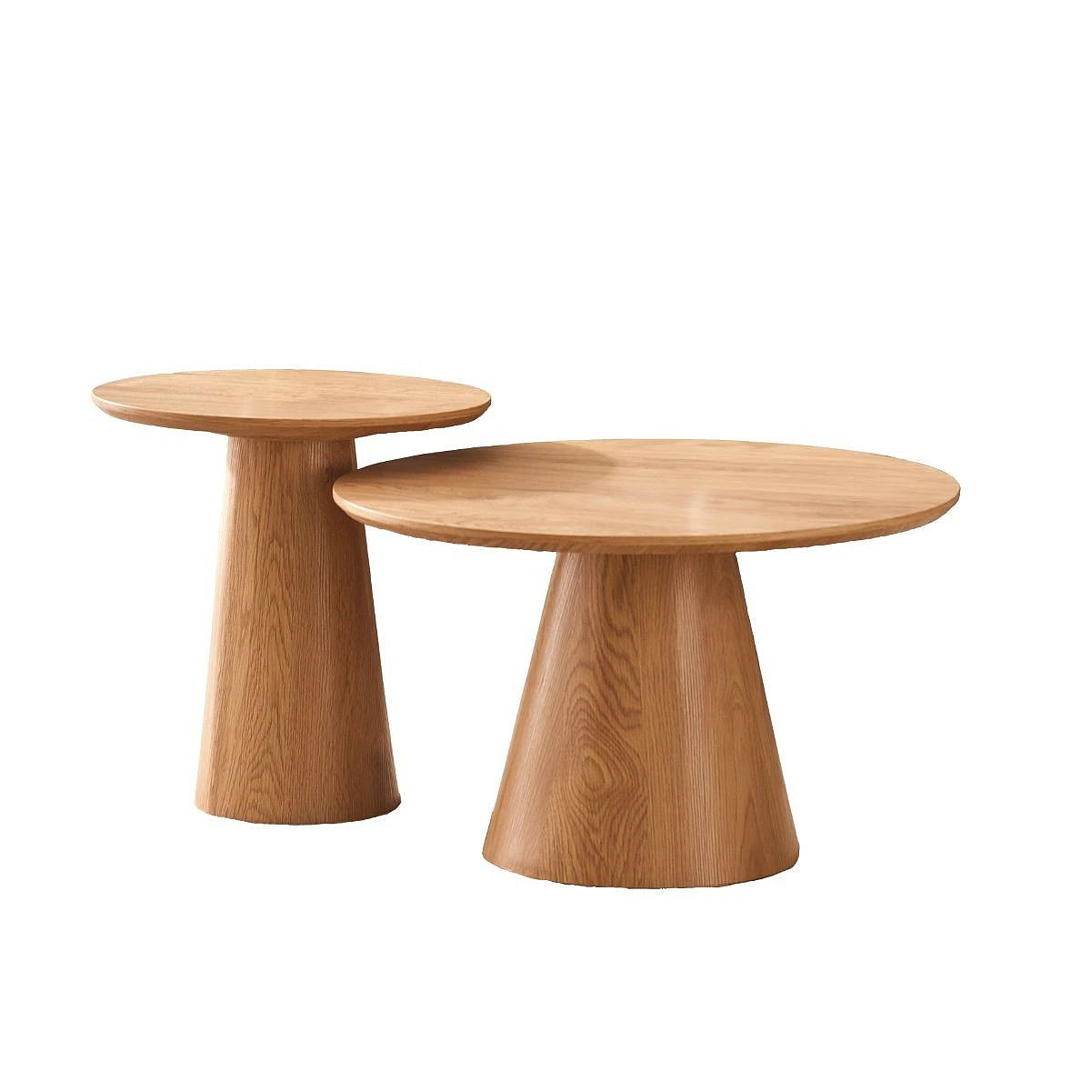 Juego de mesas auxiliares de centro con tapa de MDF de 18mm. de grosor, laminada en color roble. Base cónica laminada en el mismo color. Robusta y elegante, ideal para cualquier espacio. Medidas: 60 X 36cm / 40 X 42cm.