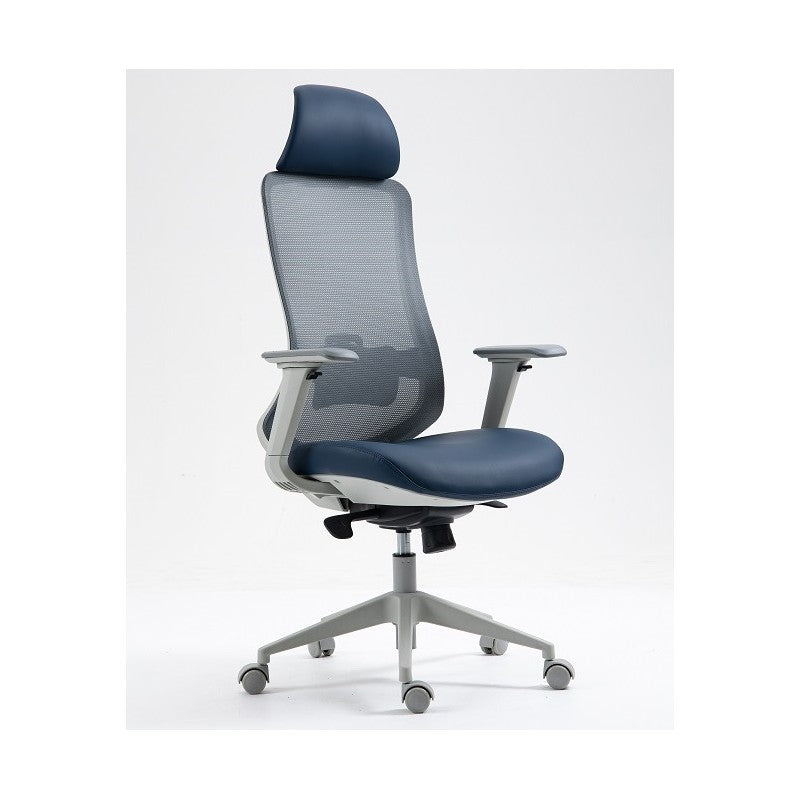 Sillón de oficina ergonómico, multifunción, malla azul y asiento en similpiel azul.